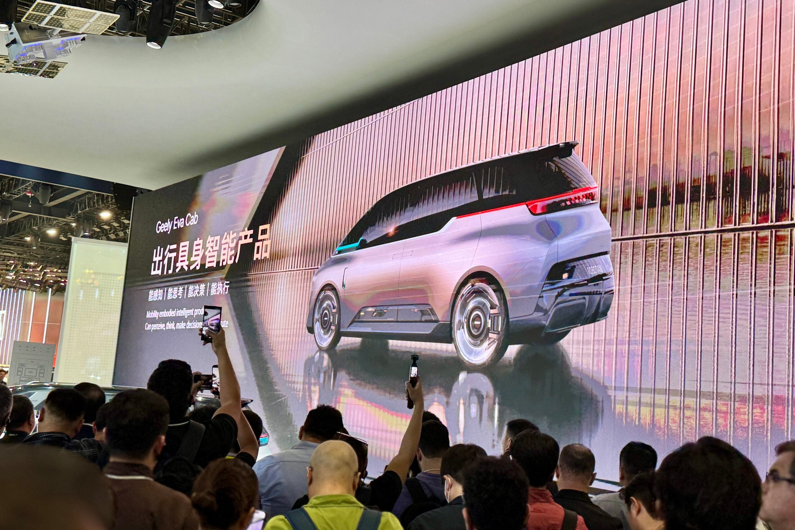 El conceptual Eva Cab es es un monovolumen edificado sobre la arquitectura EEA 4.0 de Geely, que tiene la particularidad de contar con dos puertas corredizas en el lado derecho que dan acceso a una especie de living sobre rudas, con un techo panorámico y asientos cara a cara. Para moverse sin conductor, el vehículo de ensayo posee un radar LiDAR 2160 con alcance de 600 metros -que es el más avanzado de la industria- y un cerebro ultrarrápido G-ASD L4.