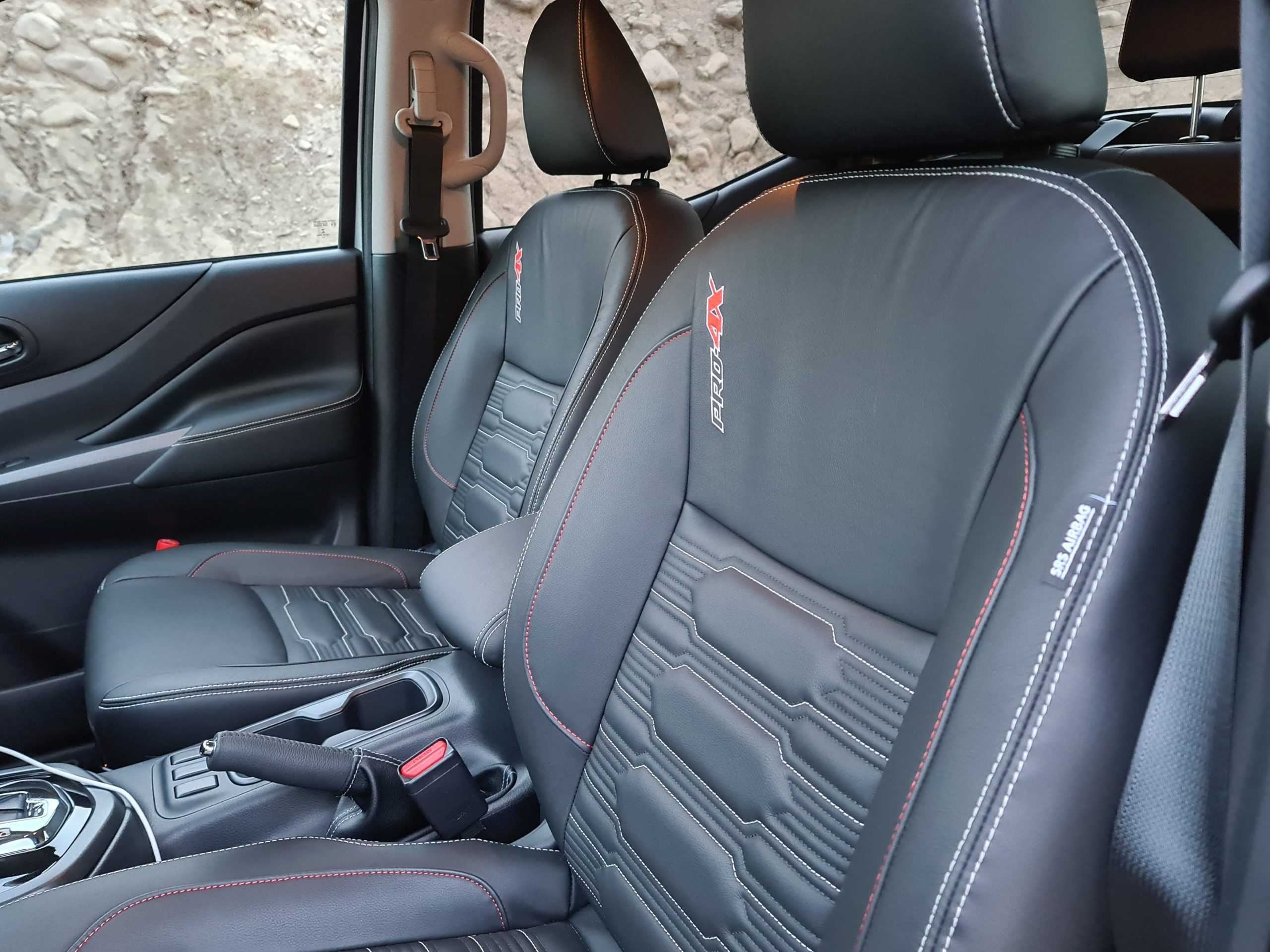 Las formas generales del tablero se mantienen invariadas, así como los materiales duros de casi todas las superficies. Los asientos son nuevos, y exclusivos de esta versión, con un tapizado en cuero negro, pespuntes color naranjo, inscripciones Pro4X, así como un patrón diferente de texturas. Solo se extraña la regulación eléctrica y calefacción.
